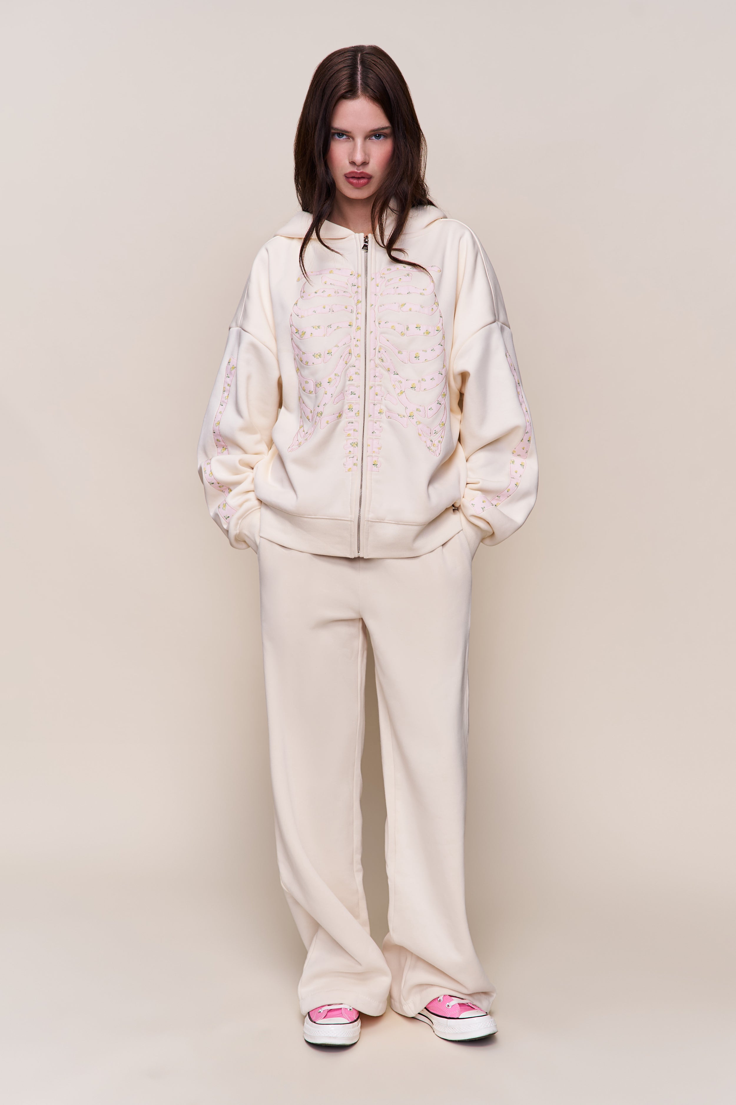 - The Clifton Hoodie takes shape in an oversized silhouette, detailed with satin floral appliqué bones tracing the front and sleeves. A playful clash of sweet and skeletal, grounded in soft ivory fleece. Pair back with the matching pant for the full set.