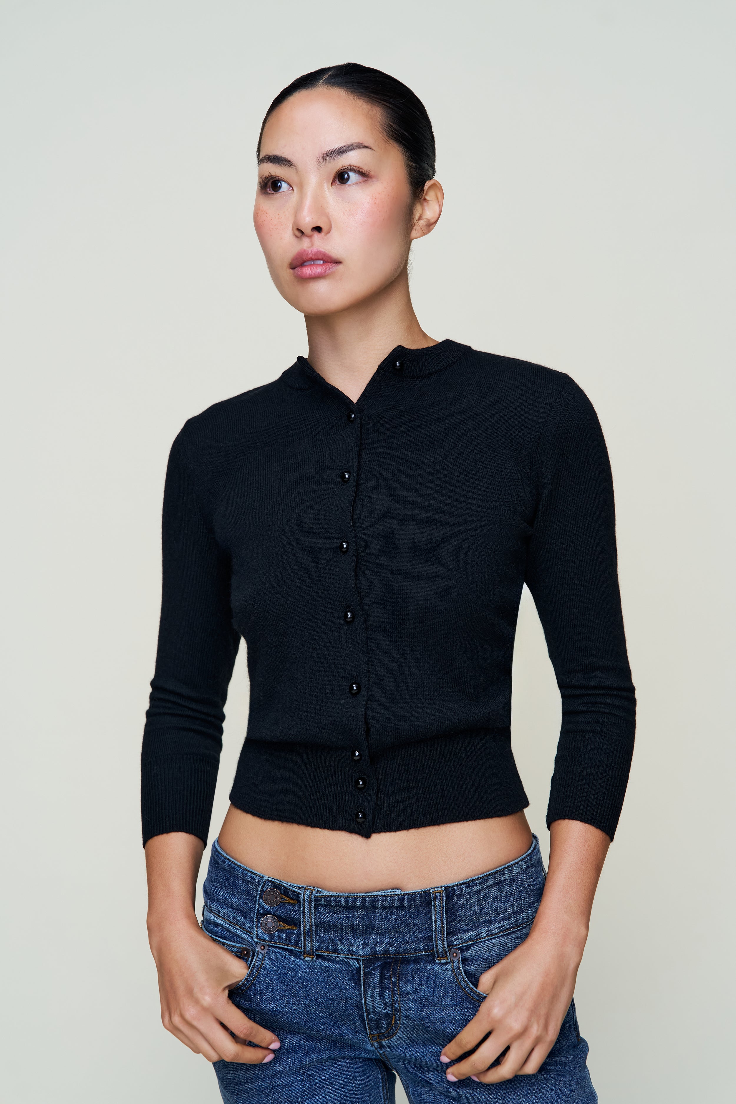 - Button-down cropped cardigan that sits right above the hip. Sleeves features a nice fold-over detail.